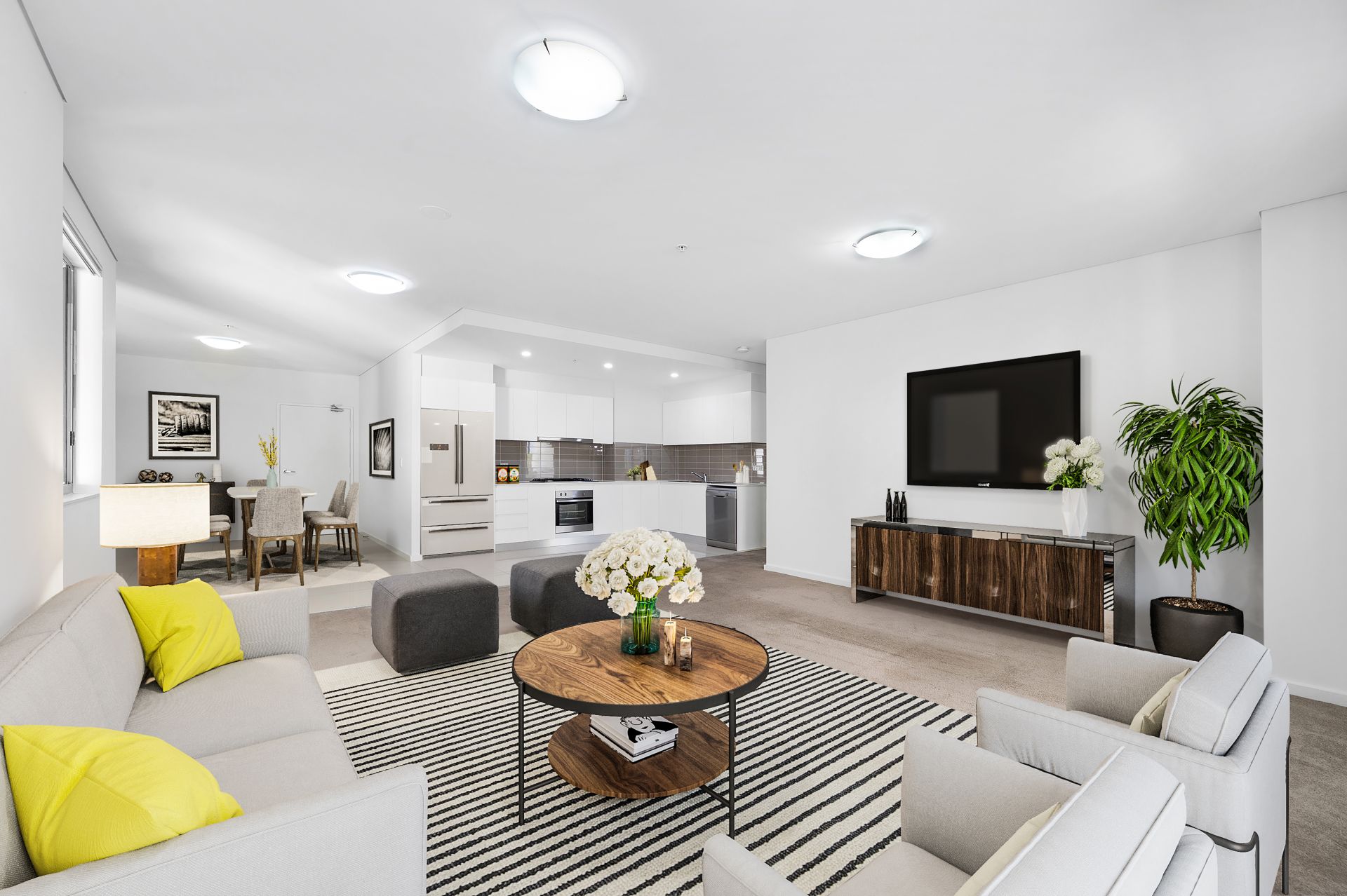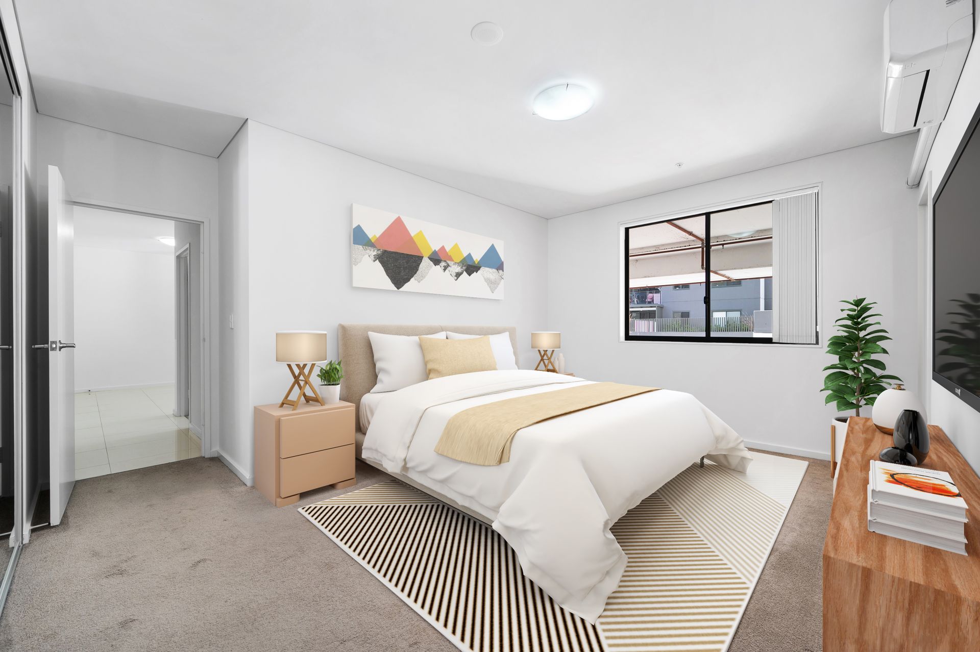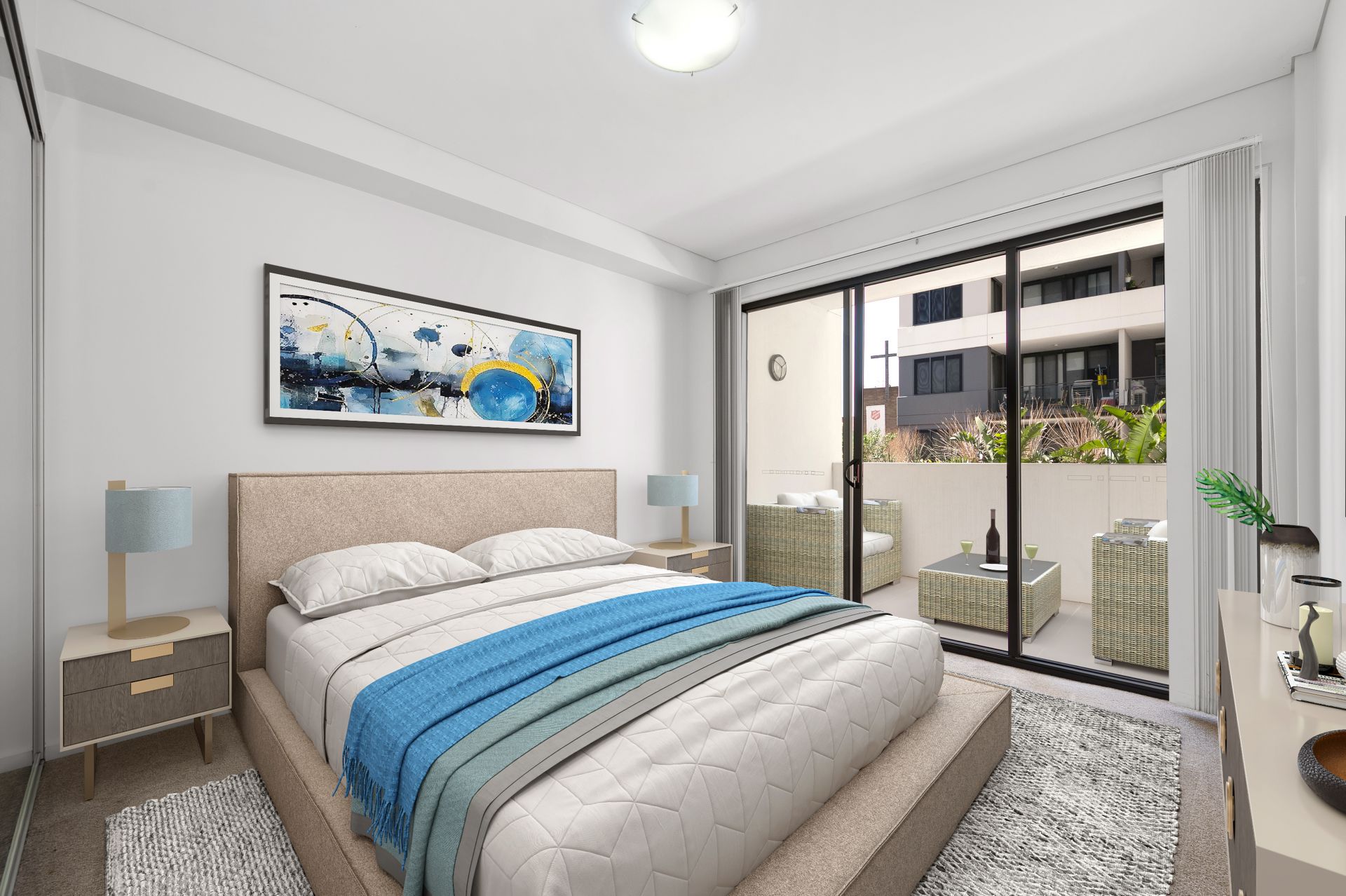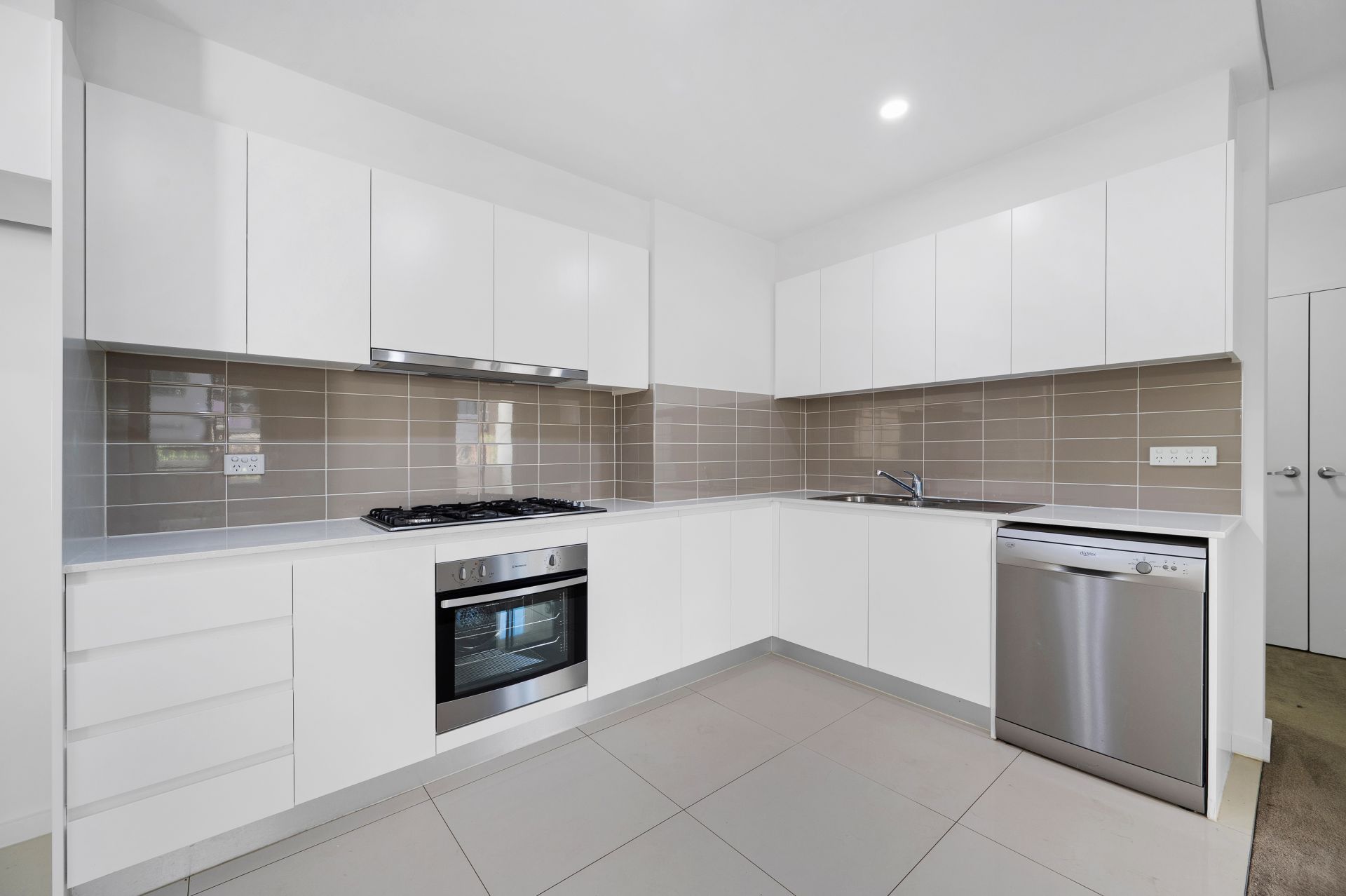 This elegant apartment offers a perfect blend of modern luxury and convenience, designed to impress. The European-inspired kitchen is a standout, featuring sleek 20mm Caesar stone quartz bench tops and top-of-the-line stainless steel appliances, including a gas cooktop, under-bench oven, ducted range hood, and dishwasher.